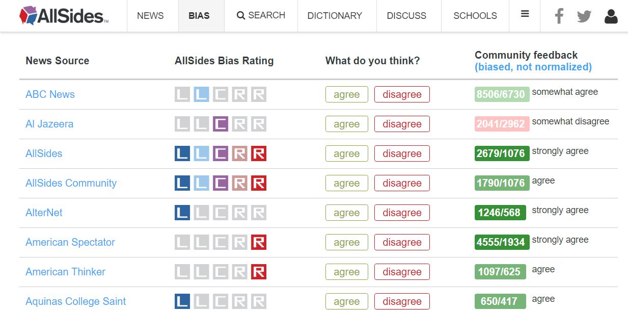 There's an interesting website called AllSides that has a media bias rating table where users can agree or disagree with the rating.