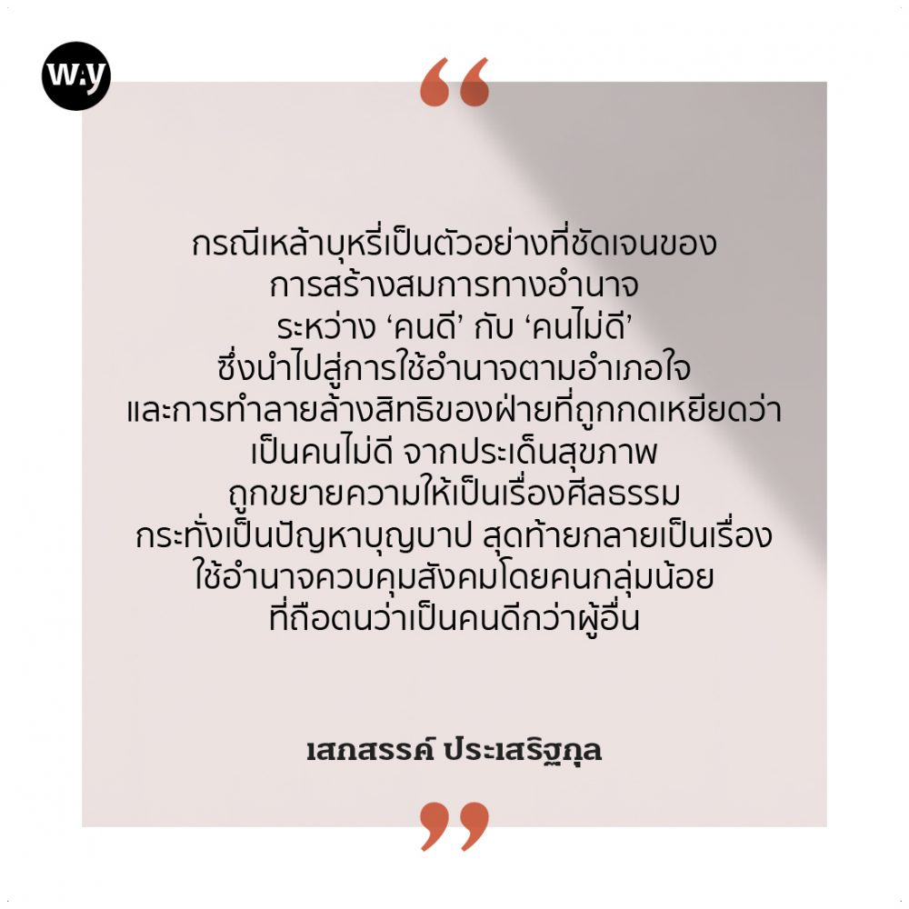 ในทัศนะของผม ซึ่งอาจจะผิดก็ได้ กรณีเหล้าบุหรี่นี้เป็นตัวอย่างที่ชัดเจนของการสร้างสมการทางอำนาจระหว่าง ‘คนดี’ กับ ‘คนไม่ดี’ ซึ่งนำไปสู่การใช้อำนาจตามอำเภอใจและการทำลายล้างสิทธิของฝ่ายที่ถูกกดเหยียดว่าเป็นคนไม่ดี จากประเด็นสุขภาพธรรมดาเหมือนประเด็นกินหวาน กินมัน กินเค็ม กรณีดังกล่าวถูกขยายความให้เป็นเรื่องศีลธรรม กระทั่งเป็นปัญหาบุญบาป สุดท้ายกลายเป็นเรื่องใช้อำนาจควบคุมสังคมโดยคนกลุ่มน้อยที่ถือตนว่าเป็นคนดีกว่าผู้อื่น