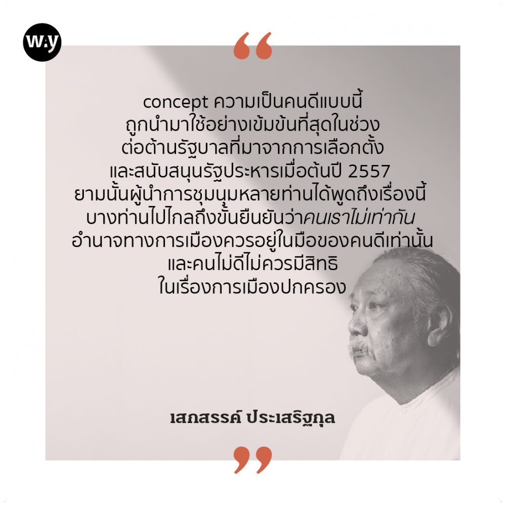 ผมคงไม่ต้องพูดก็ได้ว่า concept ความเป็นคนดีแบบนี้ถูกนำมาใช้อย่างเข้มข้นที่สุดในช่วงต่อต้านรัฐบาลที่มาจากการเลือกตั้งและสนับสนุนรัฐประหารเมื่อต้นปี 2557 ยามนั้นผู้นำการชุมนุมหลายท่านได้พูดถึงเรื่องนี้ บางท่านไปไกลถึงขั้นยืนยันว่าคนเราไม่เท่ากัน อำนาจทางการเมืองควรอยู่ในมือของคนดีเท่านั้นและคนไม่ดีไม่ควรมีสิทธิในเรื่องการเมืองปกครอง