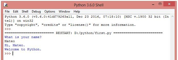 นี่เป็นผลลัพธ์การทำงานในการรันโปรแกรม first.py จาก Python shell ในตัวอย่างเราได้กรอกชื่อเป็น "Mateo" และหลังจากนั้นโปรแกรมได้แสดงข้อความทักทายและจบการทำงาน ในตอนนี้คุณยังไม่ต้องกังวลว่าโปรแกรมในแต่ละบรรทัดนั้นทำงานยังไง ซึ่งเราจะอธิบายในต่อไป