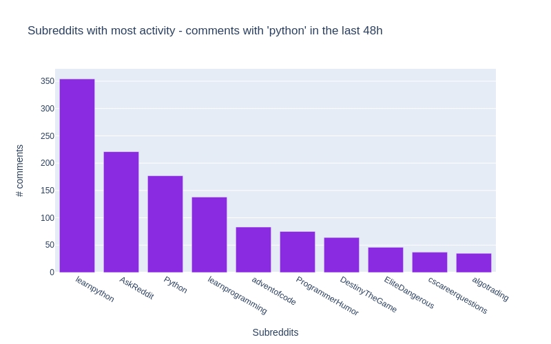 title=f"Subreddits with most activity - comments with 'python' in the last 48h",