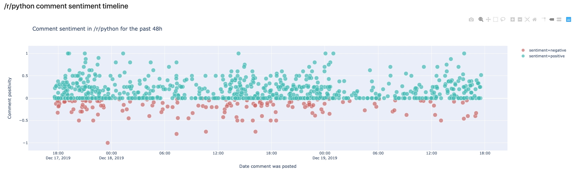 In this view, we can see the comments made in /r/python in the last 48 hours. We can see that most comments are rather on the positive side, but some are also negative. In your own notebook you’ll notice that you can hover over the comments and read the preview to see why they were classified as negative or positive.