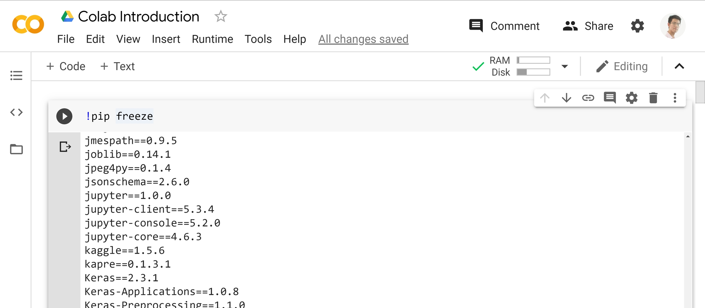 Thankfully, Colab has already provided numerous python libraries in each runtime.