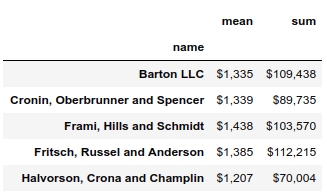 df.groupby('name')['ext price'].agg(['mean', 'sum'])