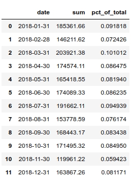 monthly_sales['pct_of_total'] = monthly_sales['sum'] / df['ext price'].sum()