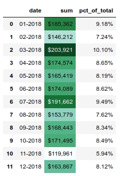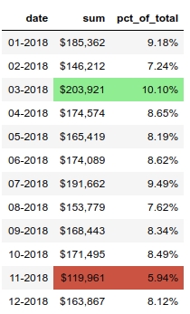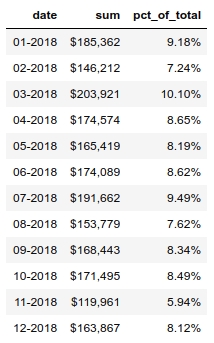 format_dict = {'sum':'${0:,.0f}', 'date': '{:%m-%Y}', 'pct_of_total': '{:.2%}'}
