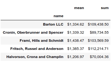 df.groupby('name')['ext price'].agg(['mean', 'sum'])