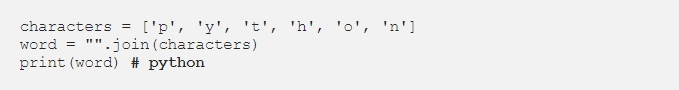 เมื่อคุณต้องการเชื่อมต่อ(Concatenate) List ของ Strings คุณสามารถทำได้โดยใช้ For Loop โดยเพิ่มเข้าไปทีละ Element แต่อย่างไรก็ตาม วิธีนี้อาจจะไม่ค่อยมีประสิทธิภาพมากนัก โดยเฉพาะถ้า List นั้นยาวมาก ๆ ใน Python นั้น String ถือเป็น Immutable ดังนั้น String ด้านซ้ายและขวา จะถูก Copy ไปยัง String ใหม่ด้วยสำหรับการ Concatenate แต่ละครั้ง