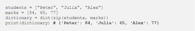 สมมติว่าเรามี List อยู่ 2 Lists โดย List แรกประกอบด้วย ชื่อของนักเรียน ส่วน List ที่สองประกอบด้วย คะแนนที่พวกเขาทำได้ เรามาดูกันว่า จะสามารถแปลงจากทั้ง 2 List ไปเป็น Dictionary เดียวได้อย่างไร เราสามารถใช้ฟังก์ชั่น zip ในการทำสิ่งนั้นได้โดยใช้ Code ตามที่แสดงอยู่ด้านล่างนี้: