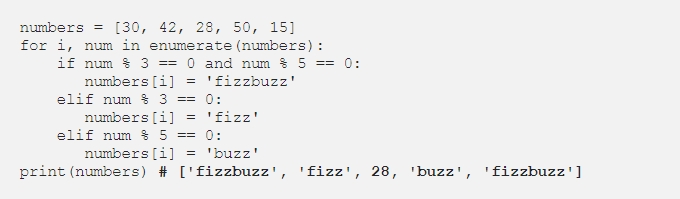 คราวนี้ เราลองมาแก้ปัญหาของ Fizz Buzz Problem กันดู โดยเขียน Program ที่ Print ตัวเลขใน List ออกมา โดยหากตัวเลขนั้นหารด้วย 3 ลงตัวให้ Print คำว่า “fizz” แทนที่ตัวเลขนั้น หากหาร 5 ลงตัวให้ Print คำว่า “buzz” และหากตัวเลขใดหารทั้ง 3 และ 5 ลงตัวให้ Print คำว่า “fizzbuzz” ออกมา