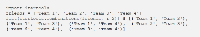 สิ่งสำคัญที่ควรสังเกตคือ ลำดับของค่า นั้นไม่สำคัญ เนื่องจาก ('Team 1', 'Team 2') และ ('Team 2', 'Team 1') ถือว่ามีความหมายเหมือนกัน ดังนั้นจะทำการแสดงเพียงหนึ่งครั้งเท่านั้นใน Output และในทำนองเดียวกัน เราสามารถใช้ itertools.permutations() ได้เช่นเดียวกันกับฟังก์ชั่นอื่น ๆ จาก Module