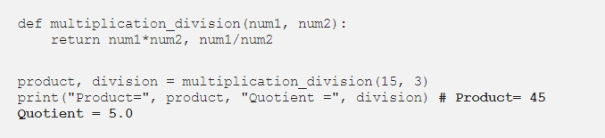 Python มีความสามารถในการ Return ค่าได้หลายค่า (Multiple Values) จากการเรียกใช้ฟังก์ชั่น ในกรณีนี้ค่าที่ Return กลับมาควรเป็น List ของค่าที่คั่นด้วยเครื่องหมายจุลภาค ( , ) และจากนั้น Python จะสร้าง Tuple และ Return ค่านี้ให้กับ ตัวที่เรียกใช้มัน ดังตัวอย่างที่แสดงด้านล่าง: