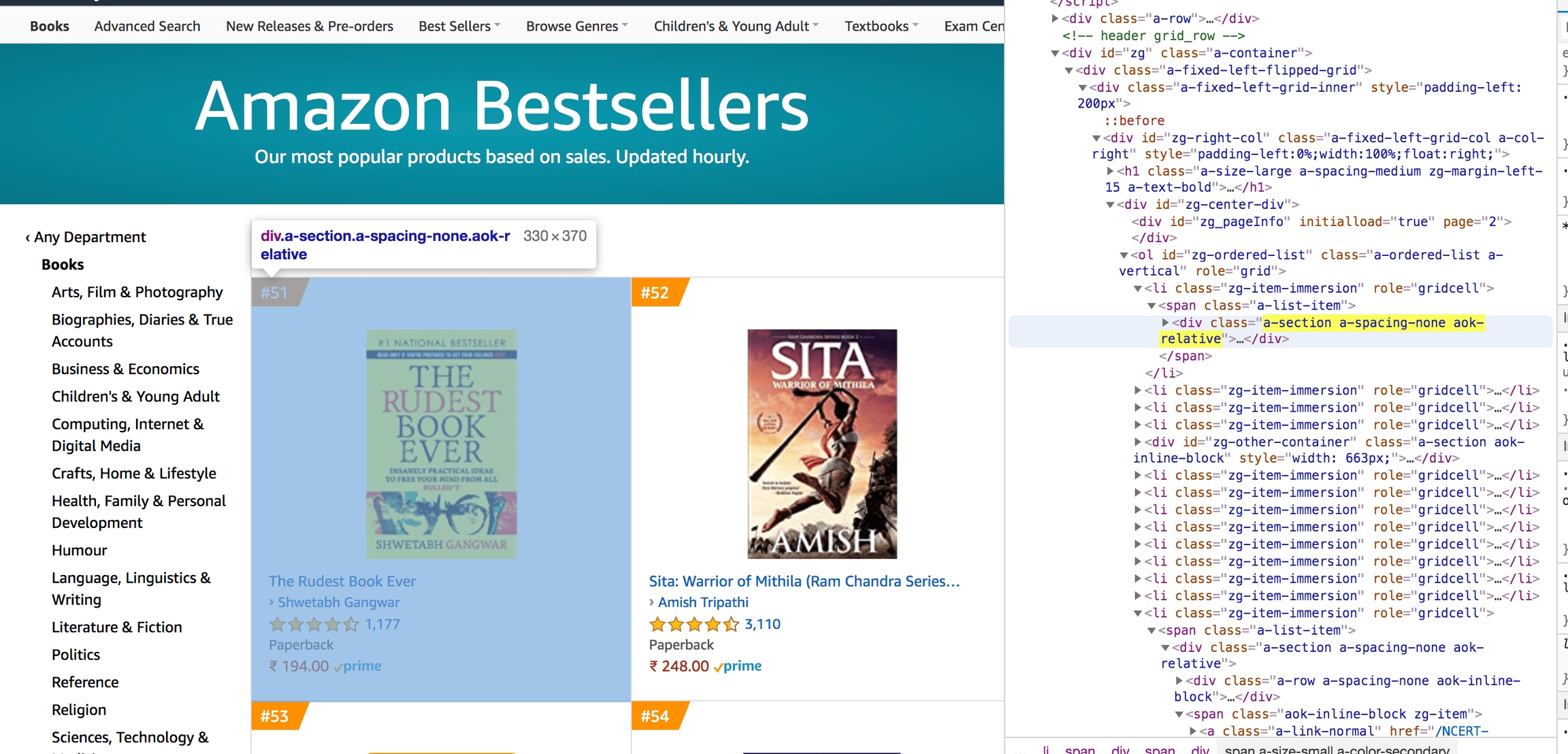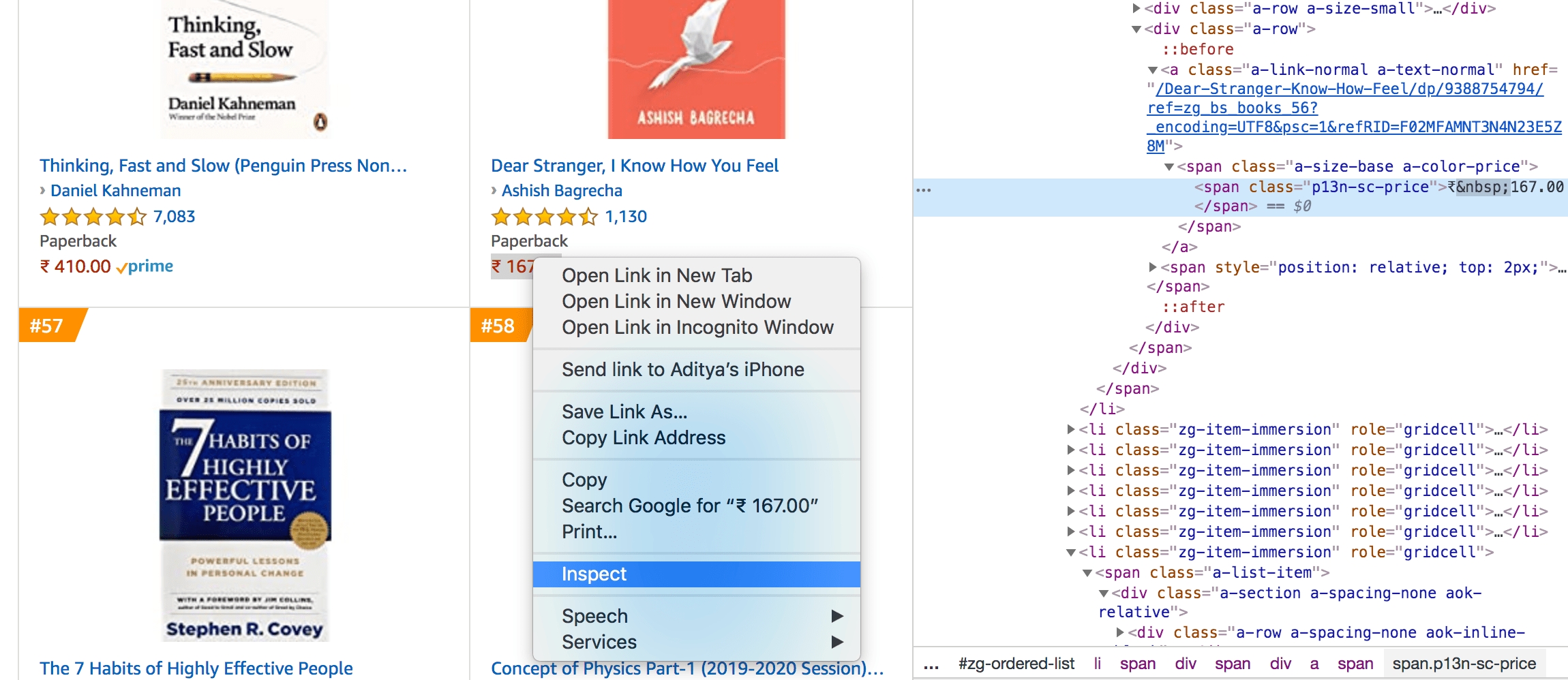 Similar to the parent tag, you need to find the attributes for book name, author, rating, customers rated, and price. You will have to go to the webpage you would like to scrape, select the attribute and right-click on it, and select inspect element. This will help you in finding out the specific information fields you need an extract from the sheer HTML web page, as shown in the figure below: