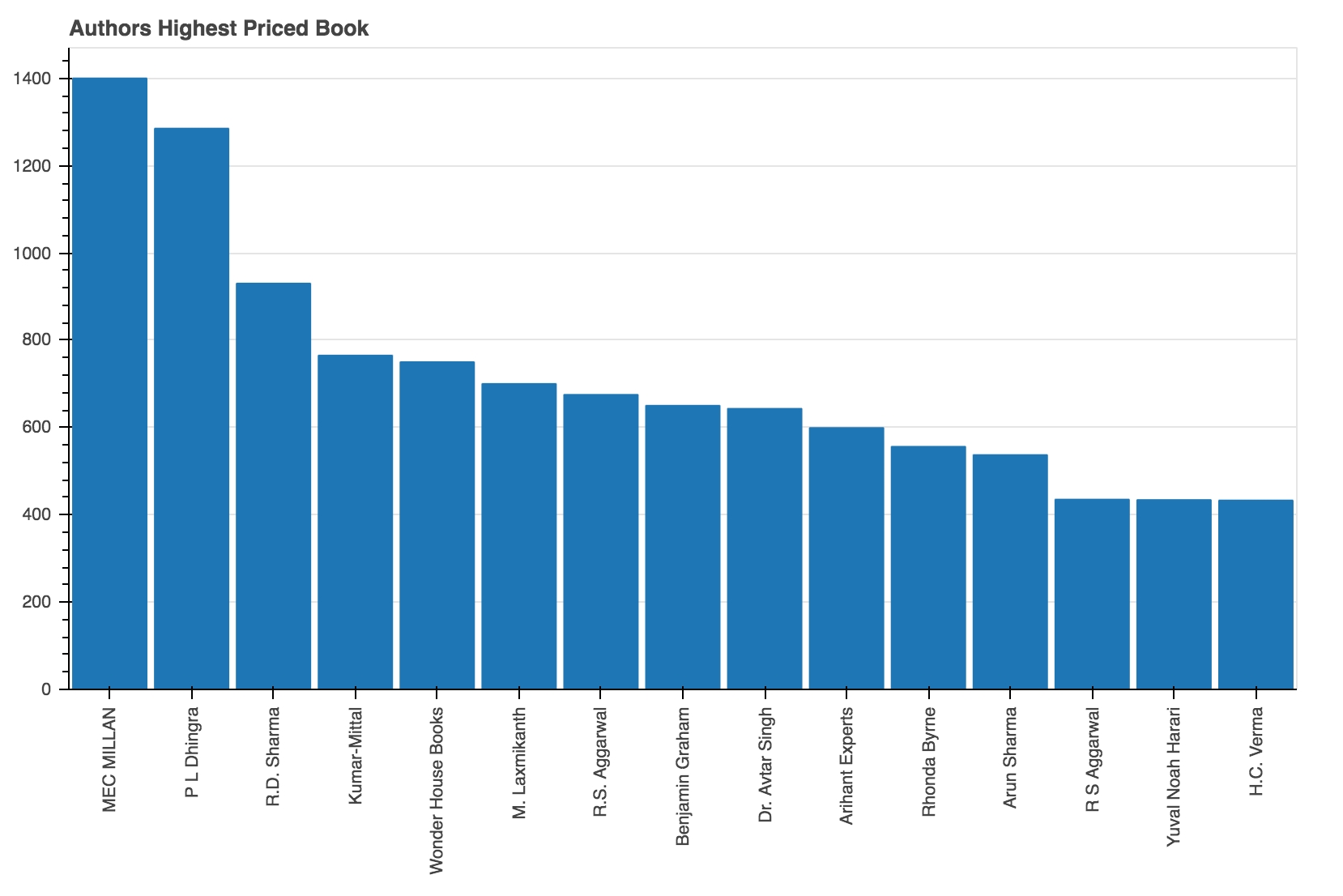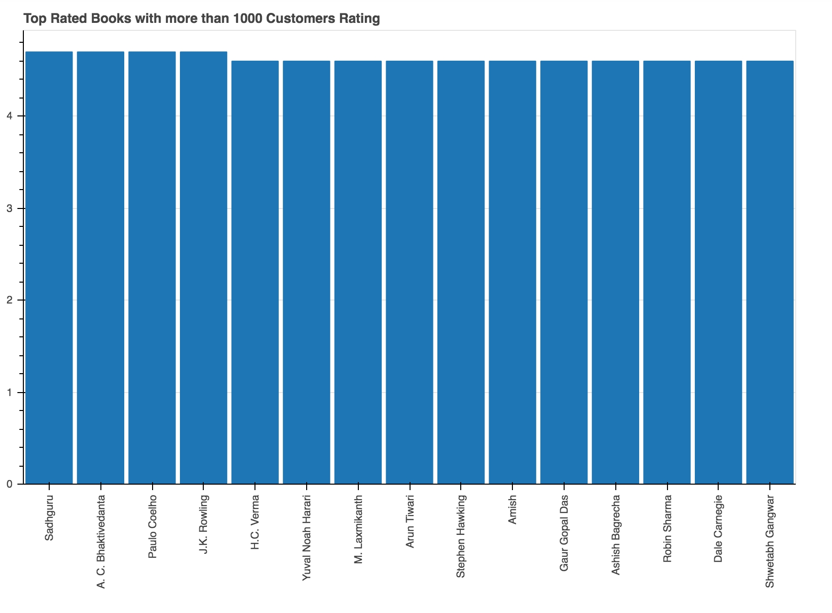 The above graph shows the top 10 authors in descending order who have the highest rated books with more than 1000 customer ratings, which are Sadhguru, A. C. Bhaktivedanta and Paulo Coelho.