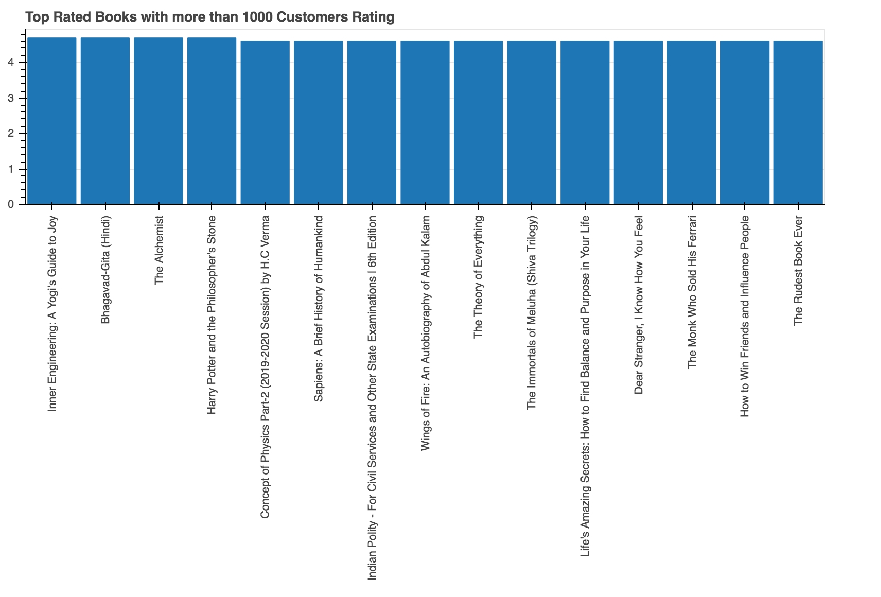 From the above output, you can observe that the top three rated books with more than 1000 customer ratings are Inner Engineering: A Yogi’s Guide to Joy, Bhagavad-Gita (Hindi), and The Alchemist.