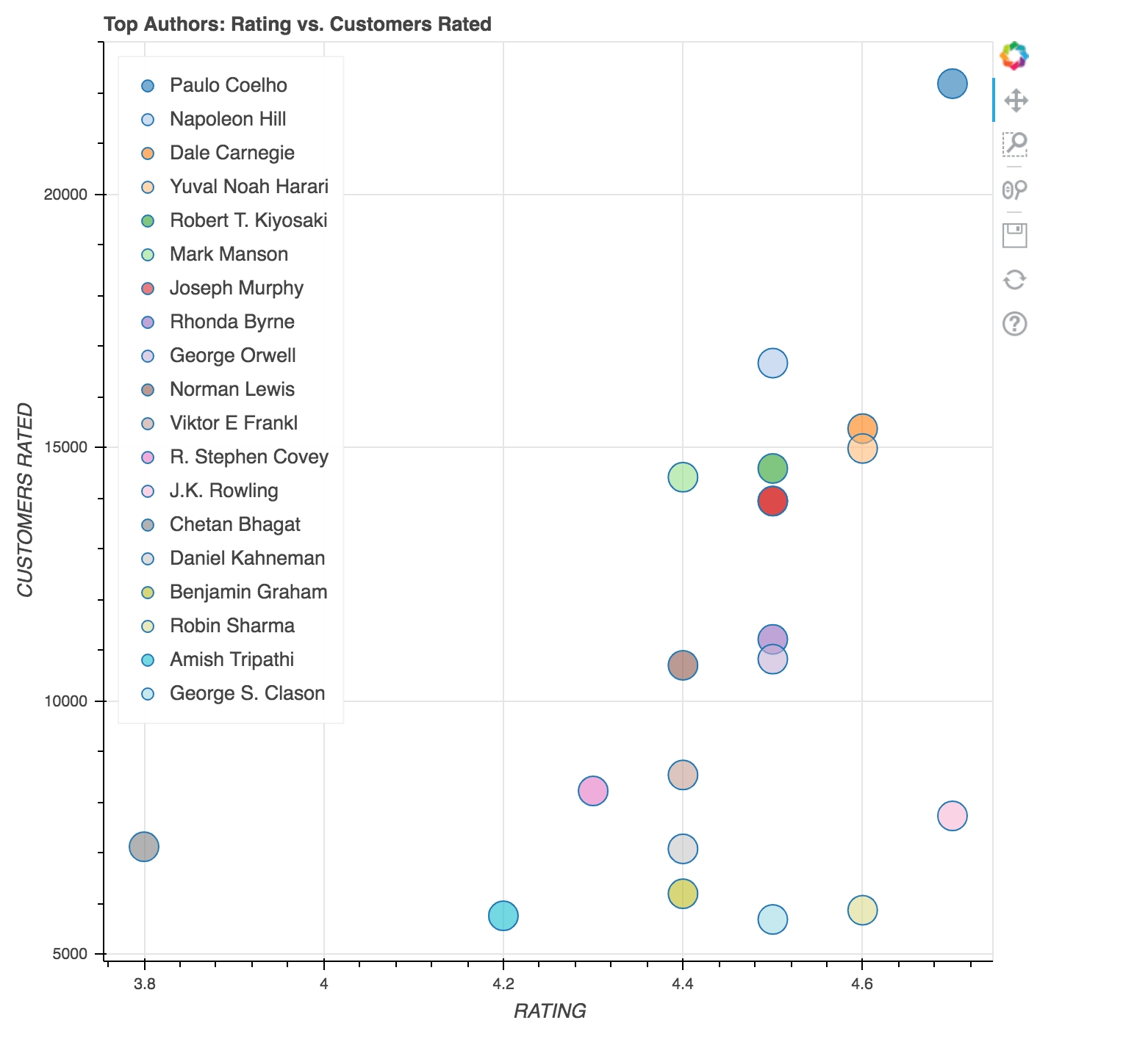 p.scatter('Rating','Customers_Rated',source=data,fill_alpha=0.6, fill_color=index_cmap,size=20,legend='Author')