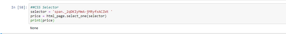 แต่ถ้าเราใส่ข้อมูลผิดจะแสดงผลว่า None จากภาพด้านบนผมจงใจจะลบ 6 ใน class ออก พอมันหา ‘span._2qDKIyMmA-jMRyfxACZWt’ ในเว็บแต่หาไม่เจอในเว็บเพราะข้อมูลที่เราใส่ผิด ได้ผลที่ออกมาเป็น None