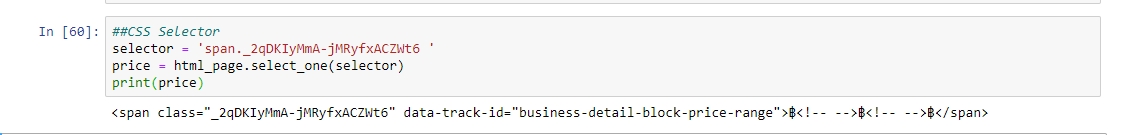 มาอีก fuction นึง .select_one(selector) เป็นการระบุว่า tag span ใน class _2qDKIyMmA-jMRyfxACZWt6 จะเลือกออกมากี่ตัว โดยจะมีอยู่ 2 แบบคือ เลือกตัวเดียว(ตัวแรกที่พบ) .select_one() หรือจะดึงออกมาทุกตัวเลย .select()จากการ select จะได้เป็นอะไรยืดยาว แต่เราพอได้ข้อมูลที่เราสนใจคร่าวๆแล้วนั่นคือ >฿<! — →฿<! — →฿<