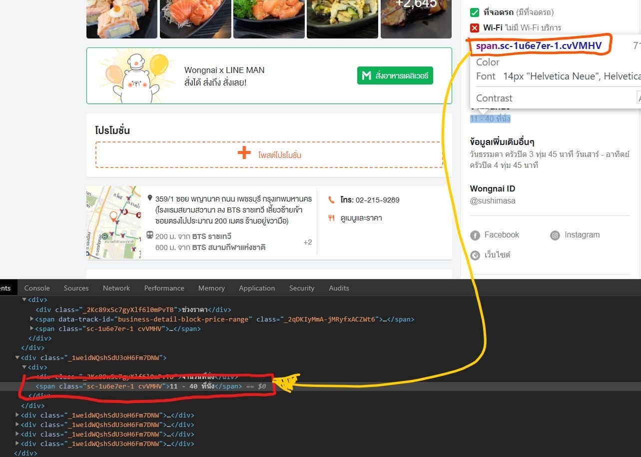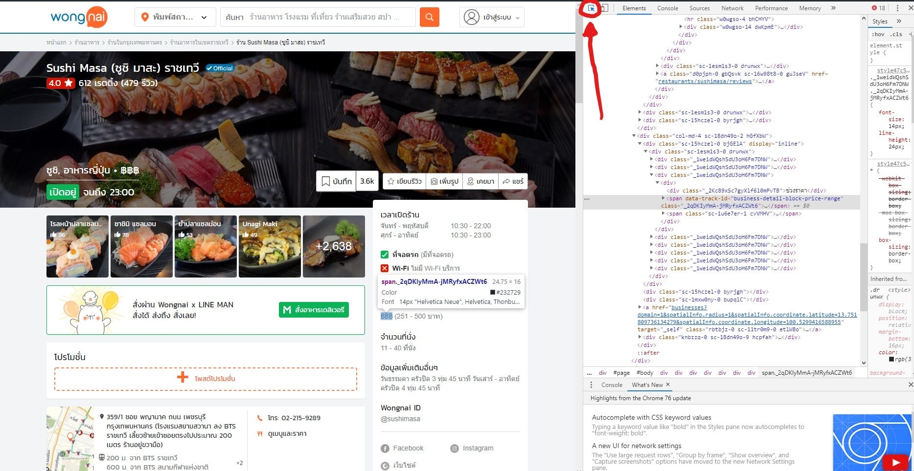 อย่างเช่นผมอยากจะดึง ประเภทราคาของร้านค้านี้ออกมา เราต้องเริ่มด้วยการไปดูก่อนว่าประเภทราคานั้นอยู่ส่วนไหนของเว็บนั้น และถูกบรรจุอยู่ในคลาสอะไร มาเริ่มกันเลยดีกว่าก่อนจะงง **อย่าลืม ethics ด้วยนะครับ อย่างใน Wongnai not allow เฉพาะ users ดังนั้นเราสามารถดึงข้อมูลในส่วนของประเภทราคาของร้านได้ครับ