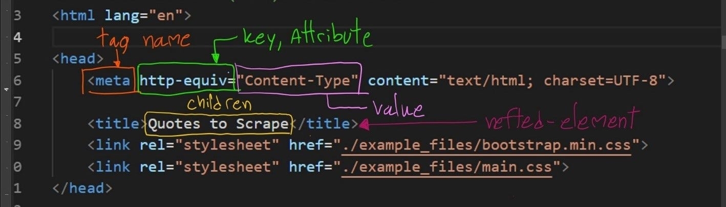 Nefted-element คือ Tag ย่อยที่ถูกบรรจุอยู่ อย่างในภาพ Tag ใหญ่ คือ <head>……</head> โดยมี Nefted-element คือ <meta> ,<title>…</title> และ <link>
