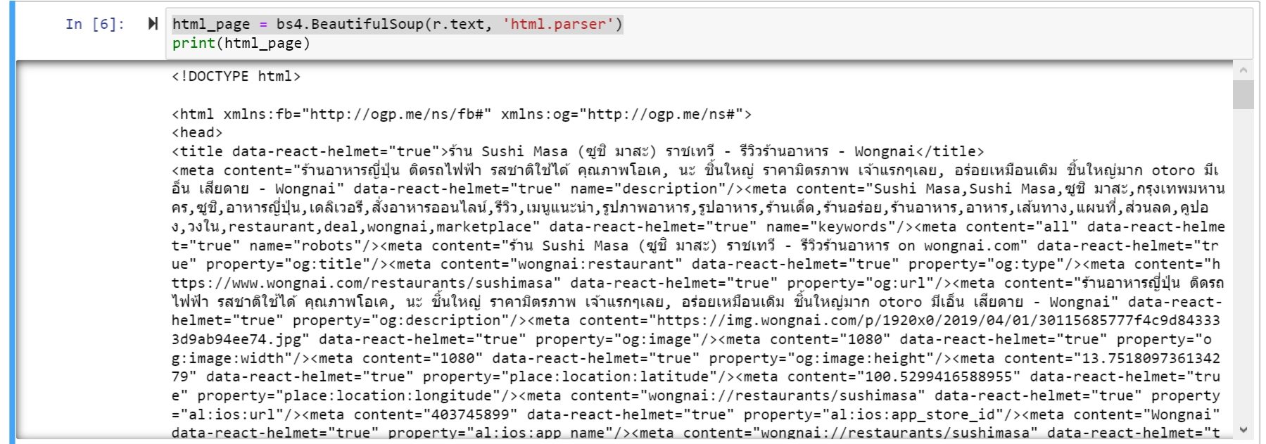 ต่อไปเราจะนำสิ่งที่เราได้มาแปลงเป็น type bs4.BeautifulSoup เพื่อให้เราสามารถใช้คำสั่งของ BeautifulSoup ในการจัดการและดึงข้อมูลออกมาได้ครับ