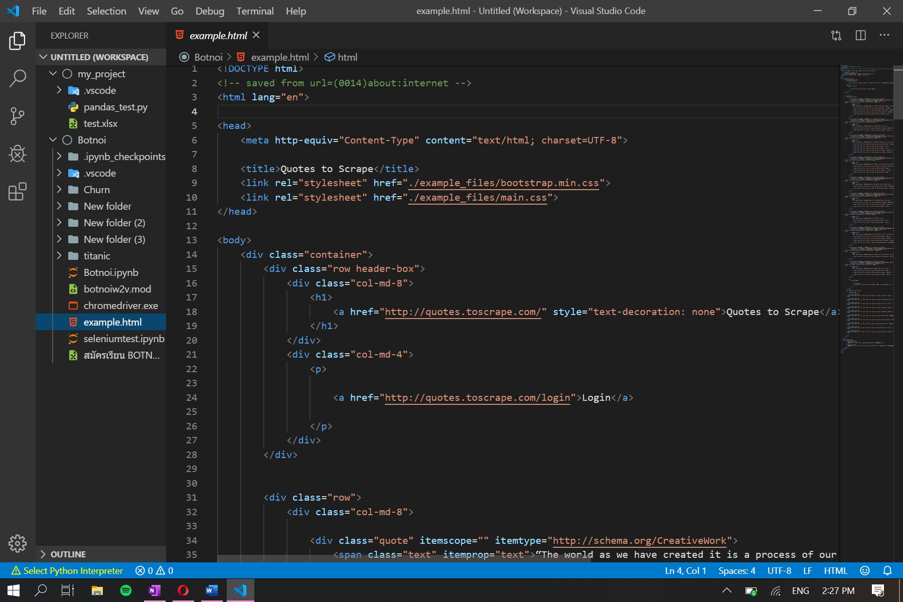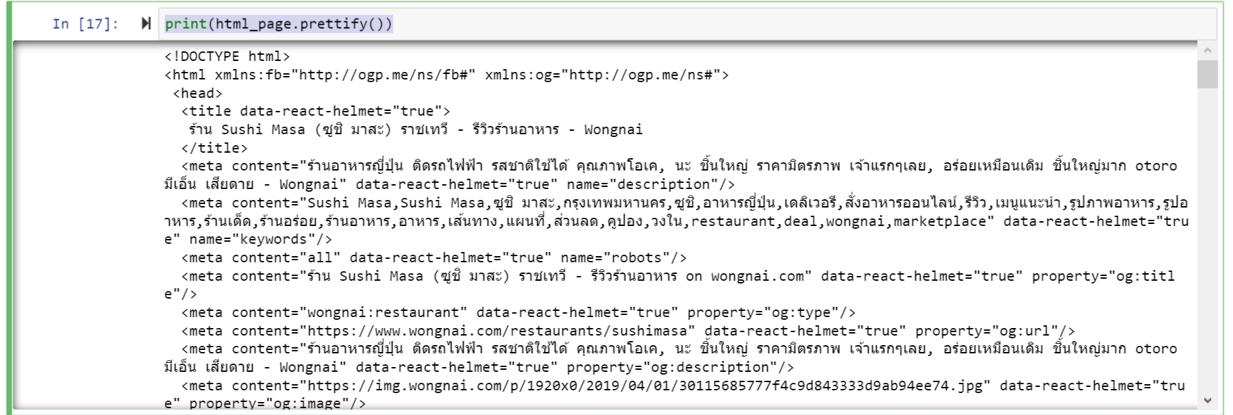 จะเห็นได้ว่า การใช้คำสั่ง prettify() ทำให้ Source code ที่เราได้มาจะถูกจัดการให้อยู่ในรูปแบบที่ดูง่ายขึ้นมากๆ ซึ่งจะอยู่ในรูปแบบที่คล้ายกับการกด F12 ดูใน web page เลยครับ
