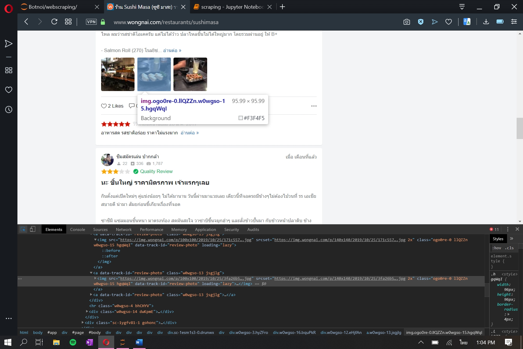 เมื่อสกัดเอาข้อมูลที่เป็นข้อความมาได้แล้ว คราวนี้เราลองมาสกัดรูปกันบ้างครับตัวอย่างภาพที่เราจะดึงลิงค์ออกมา เป็นภาพที่ผู้ใช้มาทำการรีวิวร้านนี้นะครับ