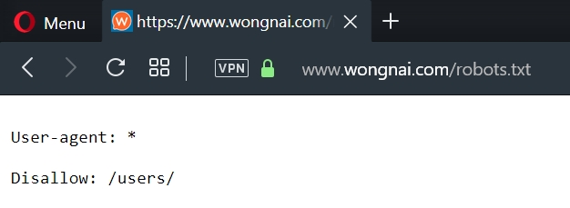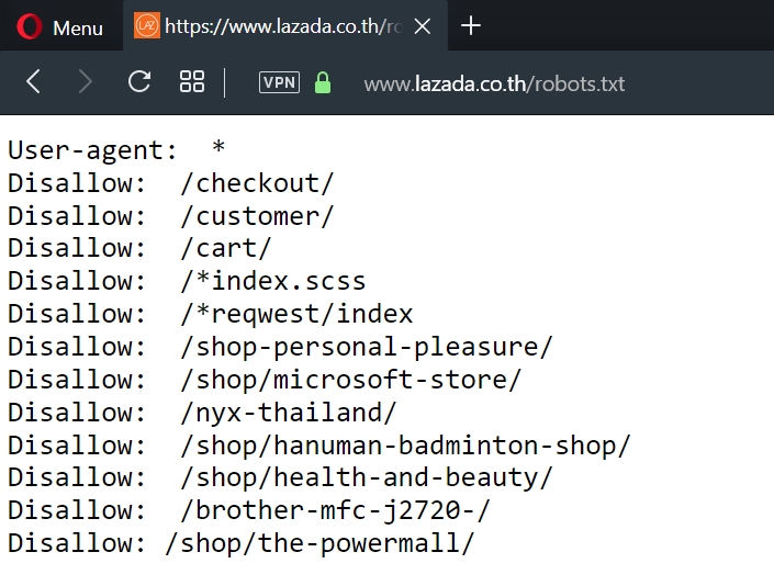 โดยเราสามารถตรวจสอบข้อมูลที่เว็บนั้นสงวนไว้ ด้วยการเติม /robots.txt หลังที่อยู่เว็บไซต์ (address) นั้นเช่น https://www.wongnai.com/robots.txtอย่างจากภาพเป็นเว็บไซต์ Wongnai จากในเว็บแสดงถึง เราห้าม (Disallow) ดึงข้อมูล Users ออกมา