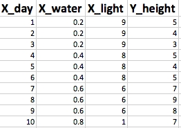 A linear regression is fairly trivial and can even be computed by hand; however, what if we varied the amount of water the plant was given each day as well as varied the amount of sunlight each day? Now our input data would look like this: