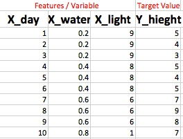 Now if someone were to ask you what would you expect the height of the plant to be on a day 3 with .7 water and 5 light, it becomes a little more challenging; however, that’s where we can start to use some machine learning techniques. Let’s add some new vocabulary to our old thinking of statistics. Our input data points are now called features and what we’re predicting/measuring are our target values.