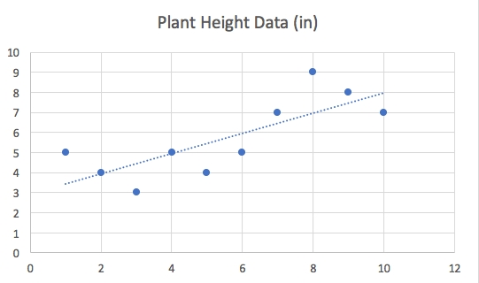 Then in class, you would be asked to add a trend line (blue dotted line). The trend line or line of best fit, tries to draw a line through the points in a way that minimizes the vertical distance (or error) between the line and each point. After you had your line, if someone asked you how tall is the plant on day 6.5, you would look at your trend line and see where the Y value intersects the 6.5 value on the trend line (~6.1).