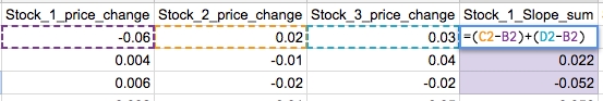 3. For each day, sum the difference between the stock of interest and the rest of the stocks in the pool. Let’s call this new column the stock’s “Slope Sum” since it sums the slope for each of the days compared to each of the stocks in the pool.