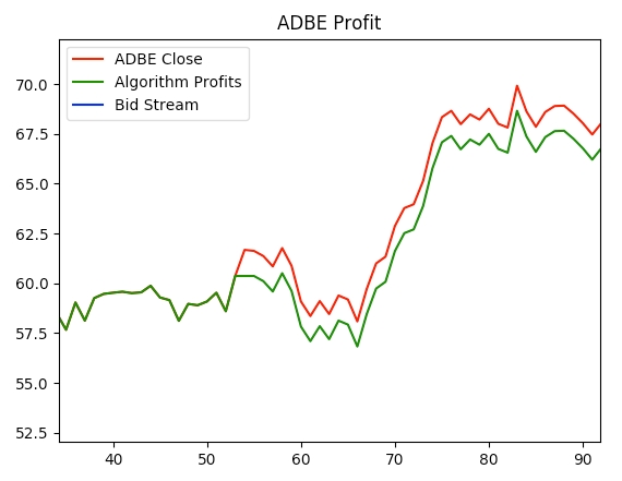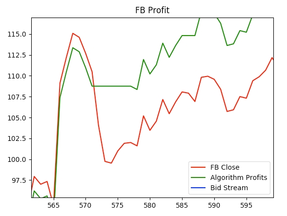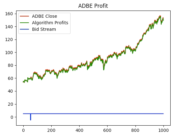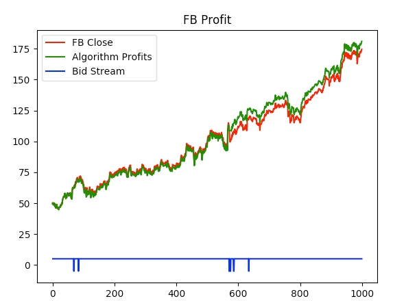 Let’s see if our model can make us any 💵 💵 💵 ! In the GitHub repository, you will find that I trained the model on the top 30 or so tech stocks by market cap. In the file tests/plotting.py you can find a function “test_plot_stock()” that takes a stock symbol and plots the stock’s close prices, our algorithm’s returns, and the bid stream.