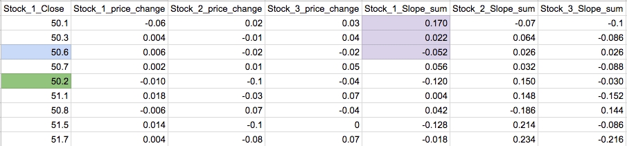 This example takes a Slope Sum sliding window batch of 3 and checks a target value 2 days into the future. In this case, the target value would be -1 since the stock price dropped over the next two days (blue cell → green cell).