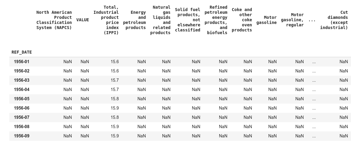 Now we move on to get some data we think will help us to predict the movement of the USD/CAD asset. That data will also come from Open Data Canada, in the form of the Industrial Product Price Index (IPPI) which should be related to how the Canadian currency fares relative to the US currency. If stuff costs more, maybe that tells us something about the economy and the currency (relative to the US). There is a lot more info I’ll skip on where this data comes from and how it is collected and calculated. Now hold onto your seat. Here we go…The full dataset (left) looks right. Taking a closer look at one decade (right) also looks reasonable. We see that not all signals start or end at the same points in time.