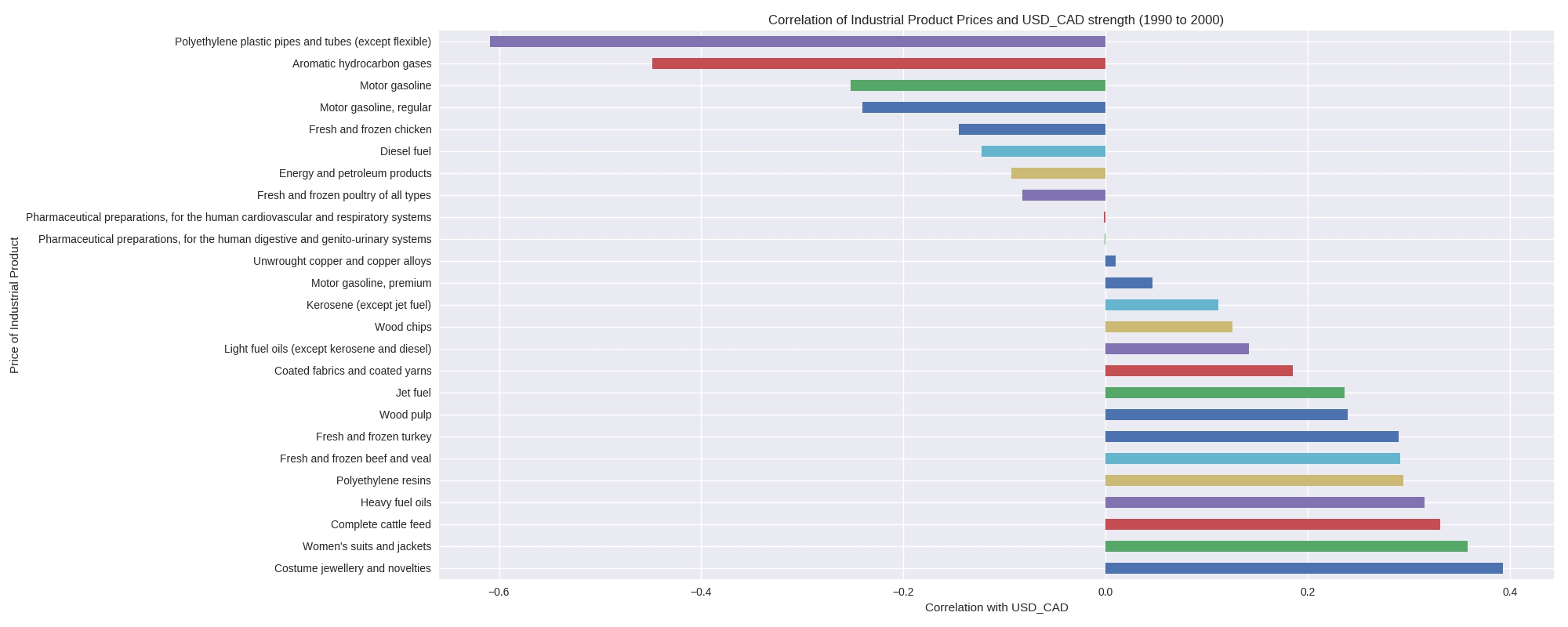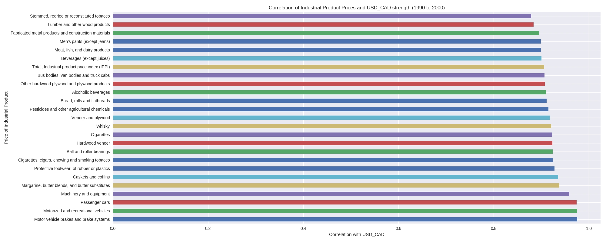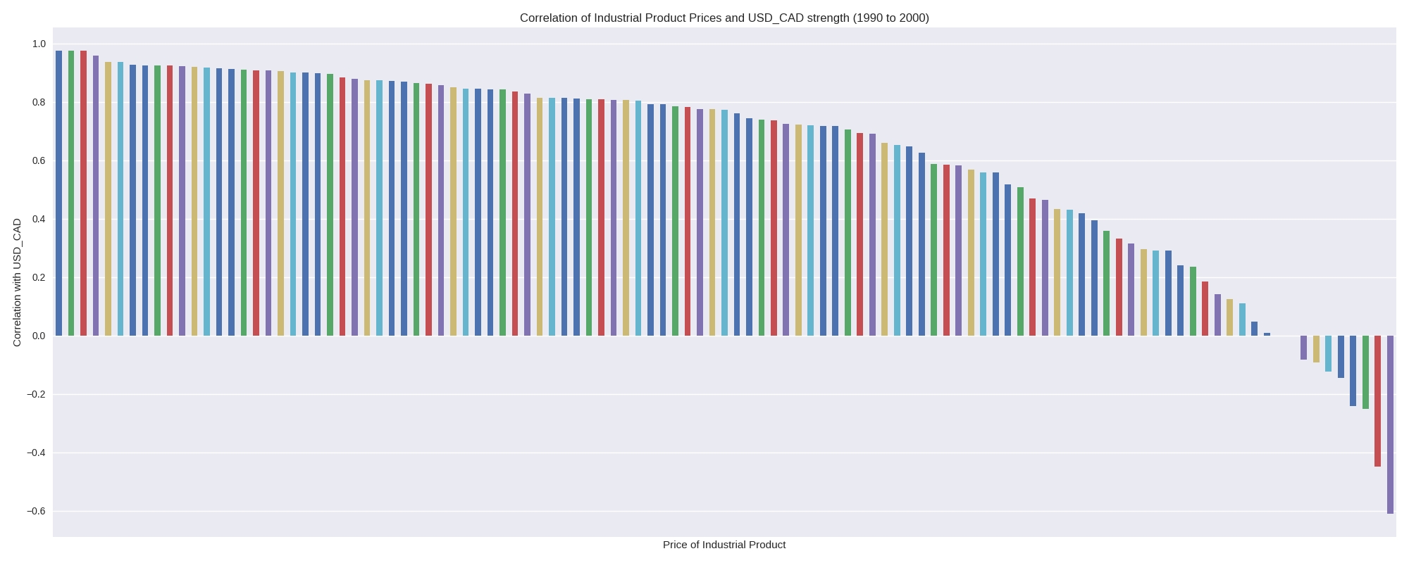 As we see in the chart below, only a few IPPI factors in the 1990s negatively correlated with USD_CAD. Wood pulp is a strange one to see with a negative correlation, because most other wood-related factors ended up with positive correlations.