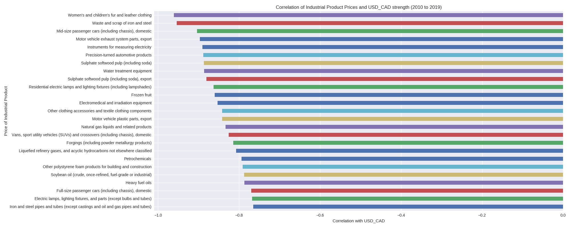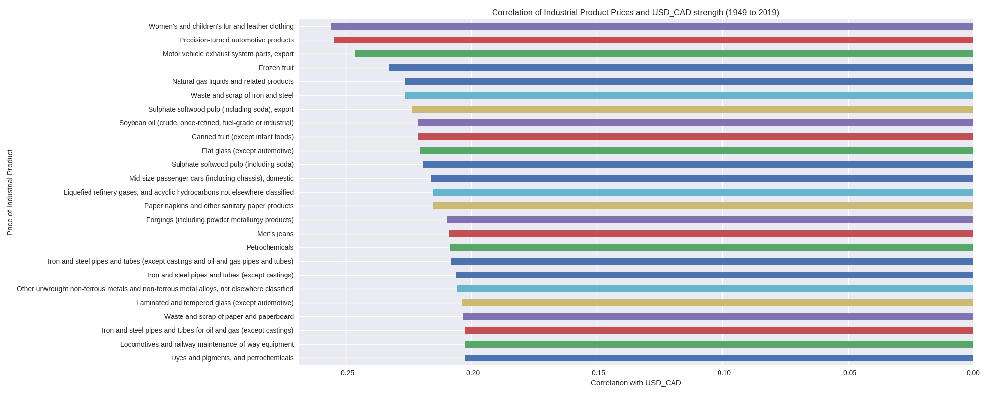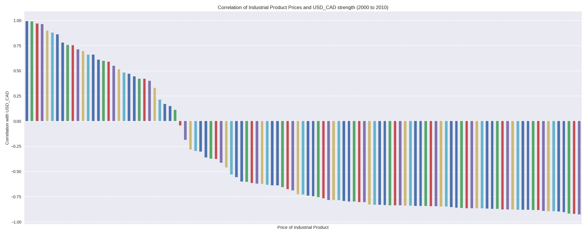 As we see in the chart below, only a few IPPI factors in the 1990s negatively correlated with USD_CAD. Wood pulp is a strange one to see with a negative correlation, because most other wood-related factors ended up with positive correlations.