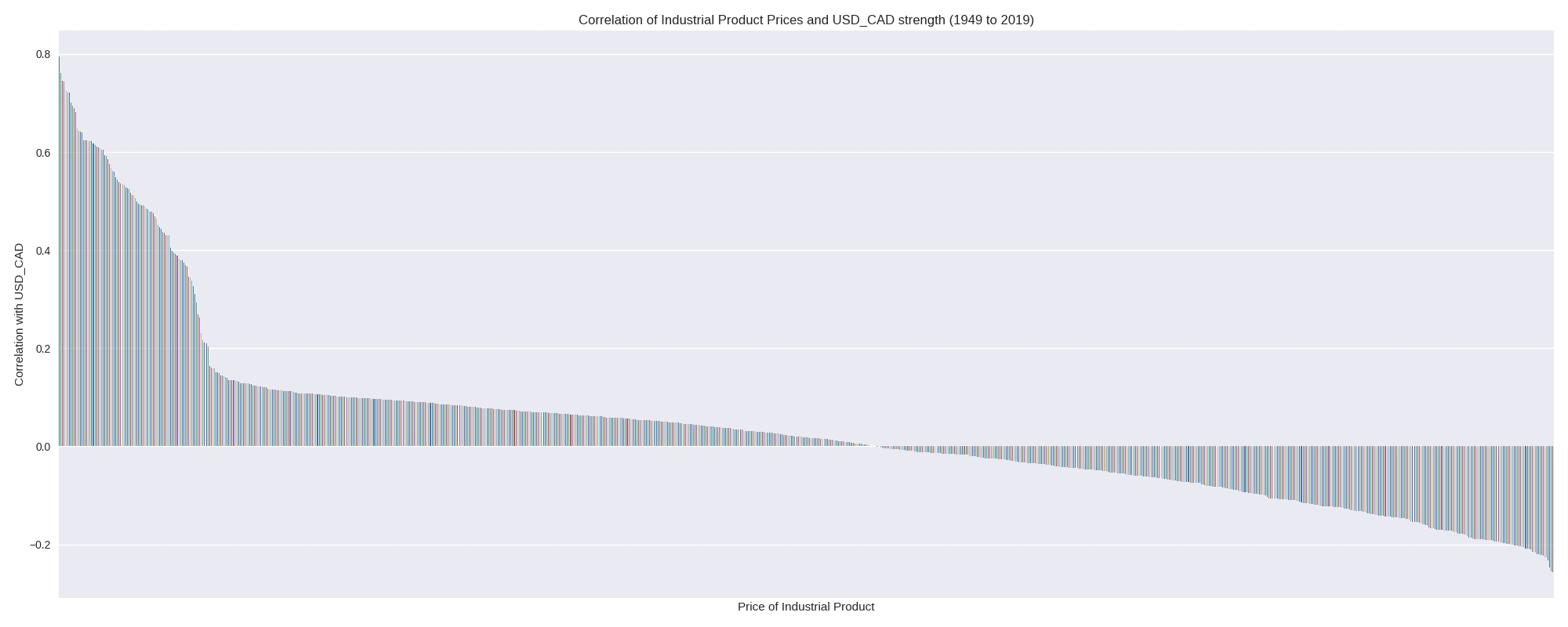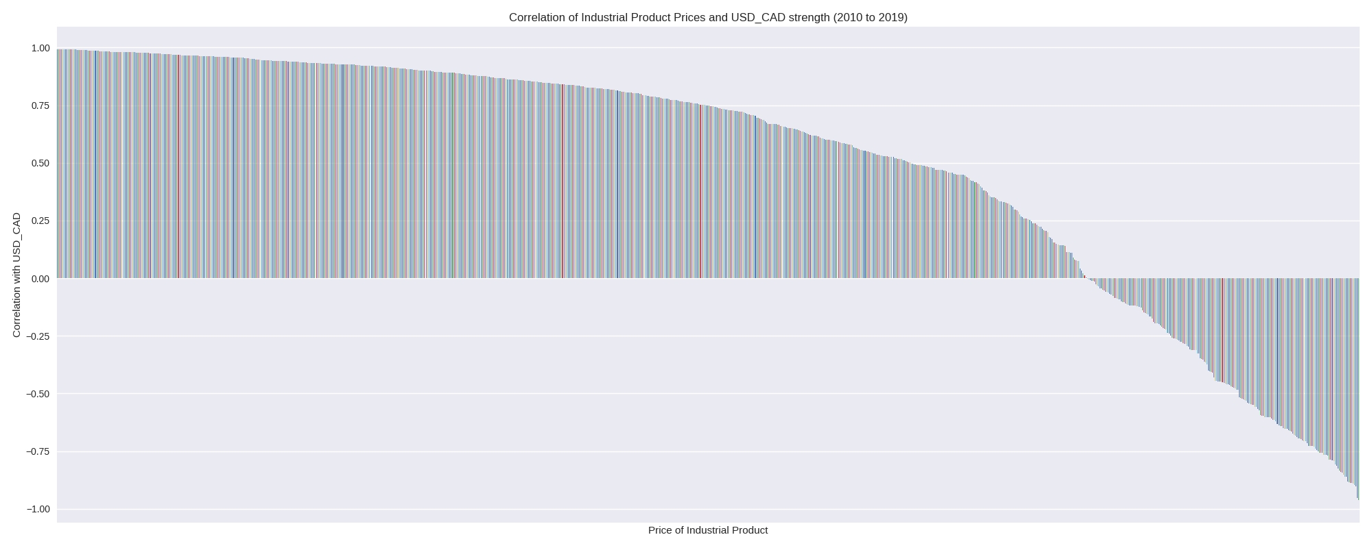During the 2010s there were a lot more factors available in the dataset. The following chart shows the distribution of USD_CAD correlations among these factors.