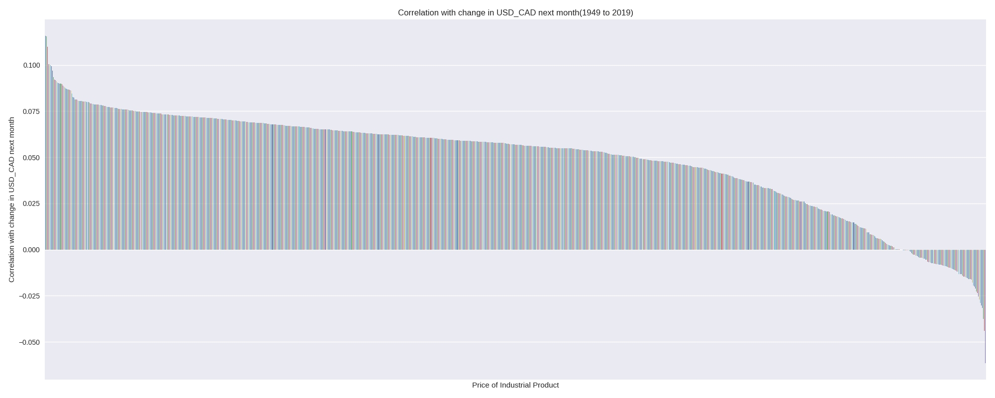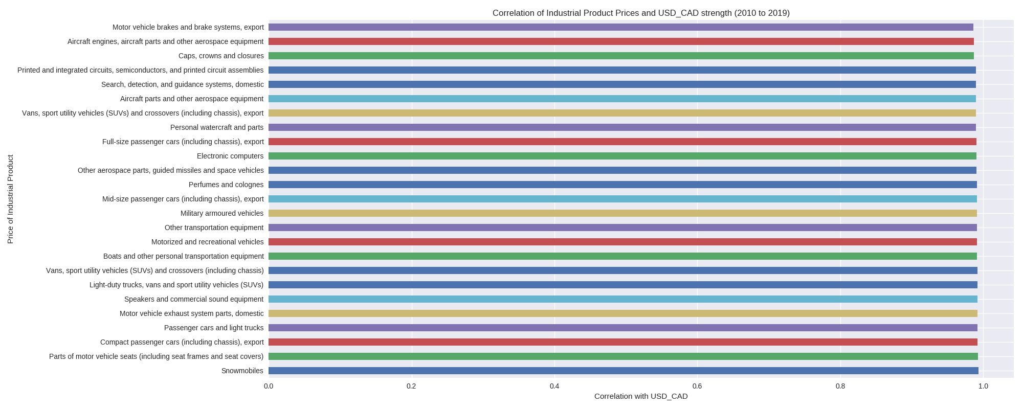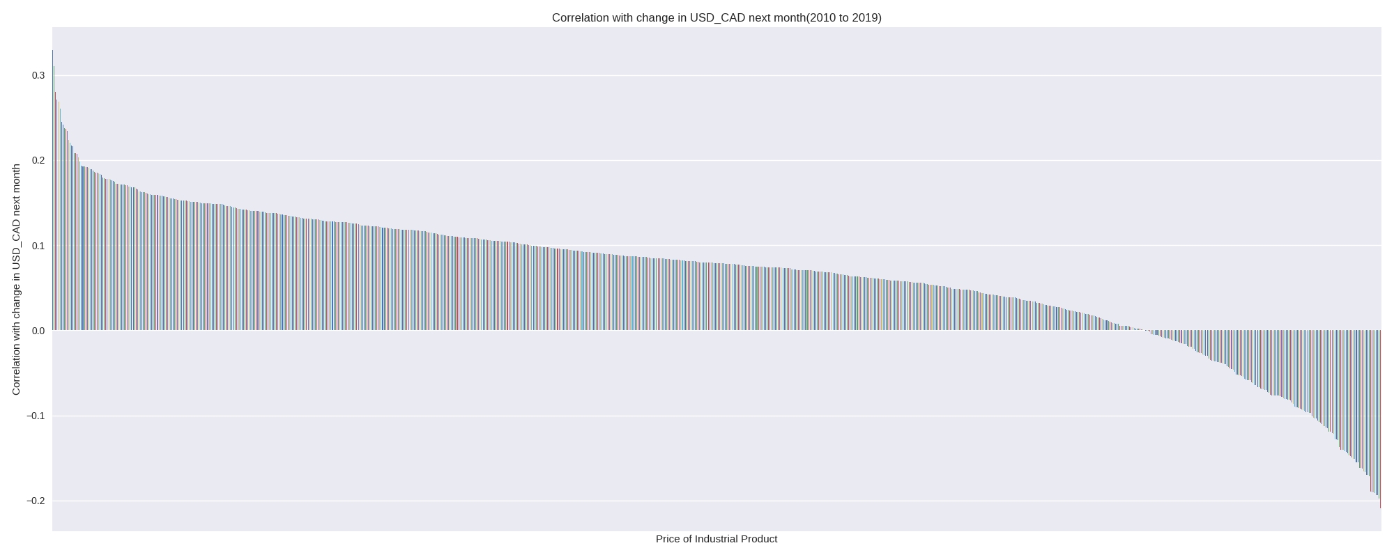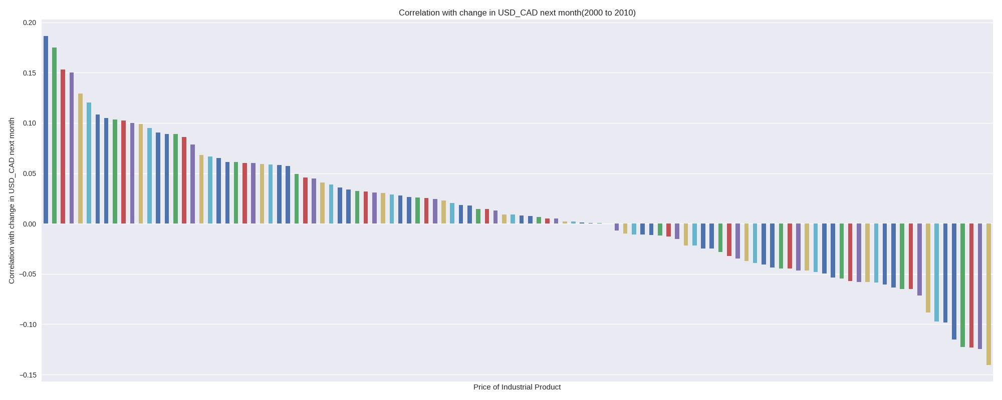 The following figure shows the correlation between IPPI factors, and USD_CAD change in value over the following month. One caveat is that the survey data may not be available, even a month later, but let’s pretend that we can get this timely data access.any factors correlate with future changes in USD_CAD