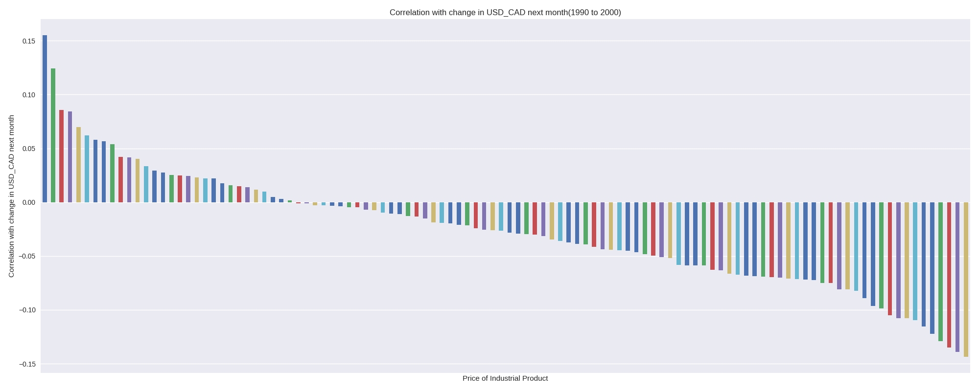 Notice that although most factors positively correlated with USD_CAD, not many were positively correlated with the change is USD_CAD. Also, notice that lots of correlations for stuff where there was no data in the 1990s are hidden from the results. In the previous section looking at all the data, any factor that had data anywhere could be correlated. Now that we are looking at a smaller subset of the data, we can only say stuff about the factors for which there was data in the 1990s.