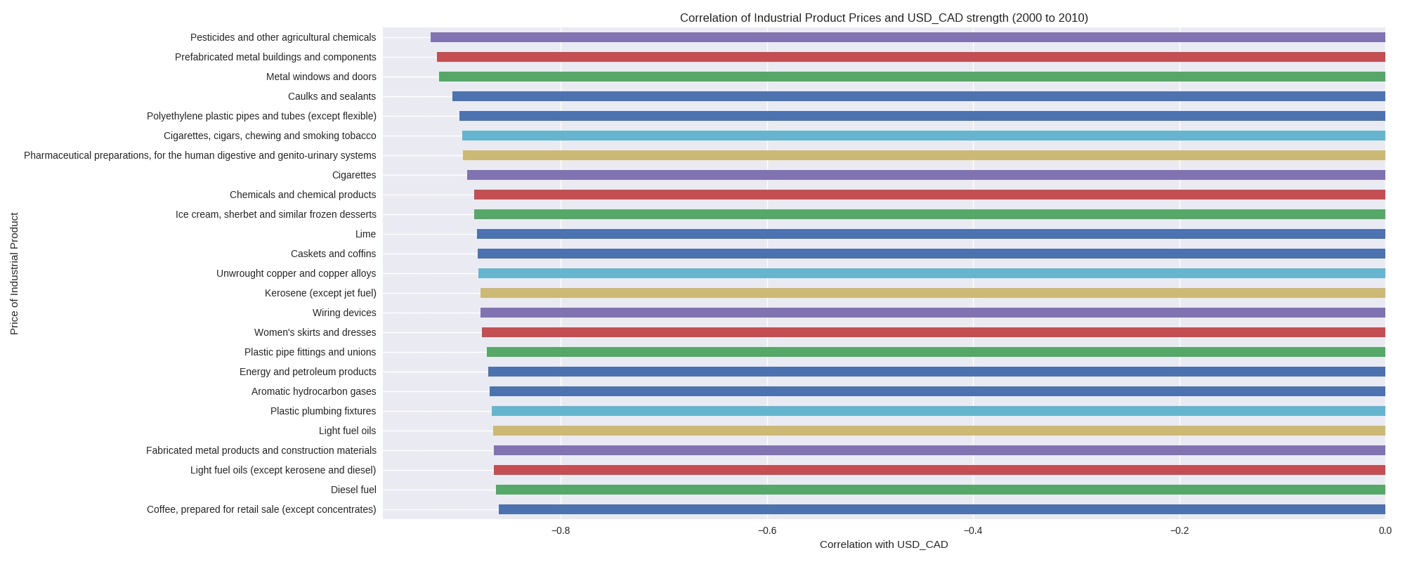 Let’s first examine stuff in the 90s that most strongly correlated with USD strength. We see some usual suspects like cars, and paper products (as mentioned above, higher prices are bad for CAD). It’s interesting to see IPPI near the top of the list, indicating that generally higher industrial product prices in Canada meant a stronger USD.