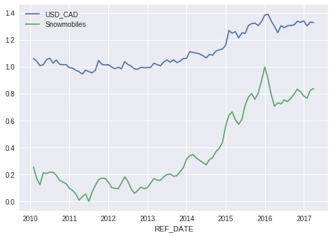I was curious to see what the story is with high correlation signals in the data. What does the correlation look like? Well, have a look at snowmobile prices and USD_CAD in the chart below.Super high correlation between USD_CAD and snowmobile prices at the factory gate. You can see it just by looking at it.
