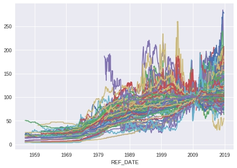 The two figures above are our initial dive into the economic data for our model. We know from the data guide that this IPPI index pegs “ Index, 2010=100” and we can see that peg clearly in the long term data (left) from the 1950s to 2019. Everything converges on 2010=100 and then expands back out from there.
