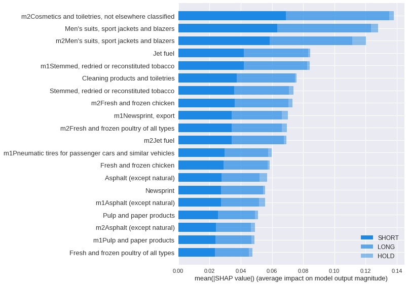 It’s cool that we have a model that makes money, but it would be great to get a better sense of what it does. I used DeepSHAP to get that picture. First, I set a prior (background) expectation using 75 samples from x_train. The rest of x_train was used for getting the SHAP values used in the next step. The following chart shows the summary plot for the x_test data using the SHAP values obtained in the last step.The relative contribution of each of the factors in our little model. Each factor is preceded by an m1 if it is from the month before the prediction, or m2 if it is from 2 months before the prediction.