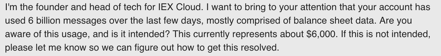 When I first started using IEX Cloud, I accidentally created an infinite loop on a Friday afternoon that contained an API call to IEX Cloud. These API calls are priced on a cost-per-call basis...which resulted in a terrifying email from IEX: