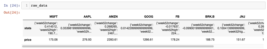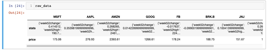 As you can see, the pandas DataFrame contains a column for each stock ticker and two rows: one for the stats endpoint and one for the price endpoint. We will need to parse this DataFrame to get the four metrics we want. Let's work through the metrics one-by-one in the steps below.