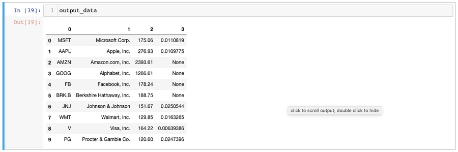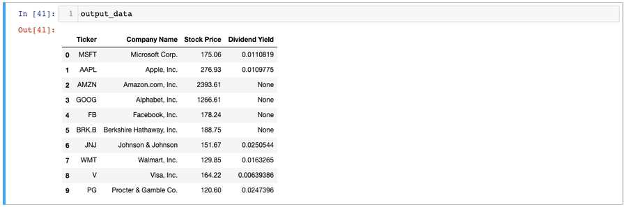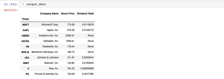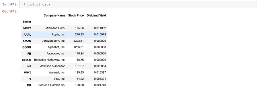 Voila! We are good to go! You can access the final version of this Python script on GitHub here. The file is named stock_market_data.py.