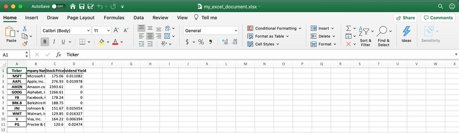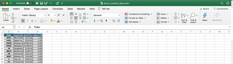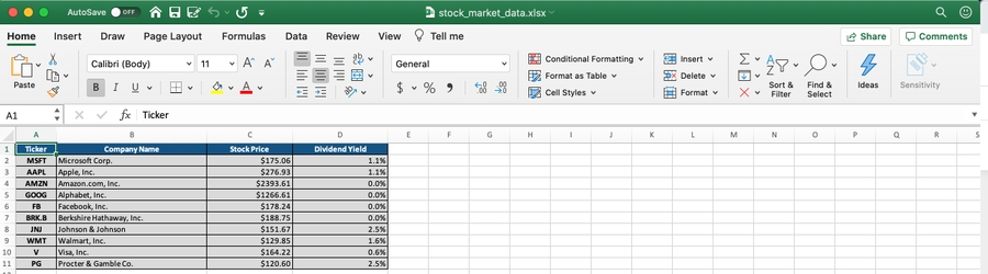 To start, let's lay out our goal posts. We are going to write a Python script that generates an Excel file of stock market data with the following characteristics: