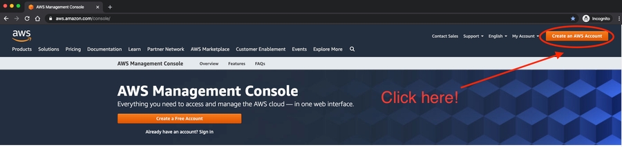 You'll need to create an AWS account first if you do not already have one. To do this, navigate to this URL and click the "Create an AWS Account" in the top-right corner: