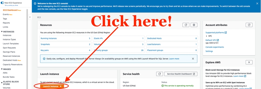 Once your account is created, you'll need to create an EC2 instance. This is simply a virtual server for running code on AWS infrastructure.